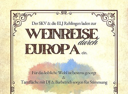 Der SKV & die ELJ Rehlingen laden zur WEINREISE durch EUROPA ein. Für das leibliche Wohl ist bestens gesorgt. Tanzfläche mit DJ & Barbetrieb sorgen für Stimmung. Weine von Weinhandel Schindel.