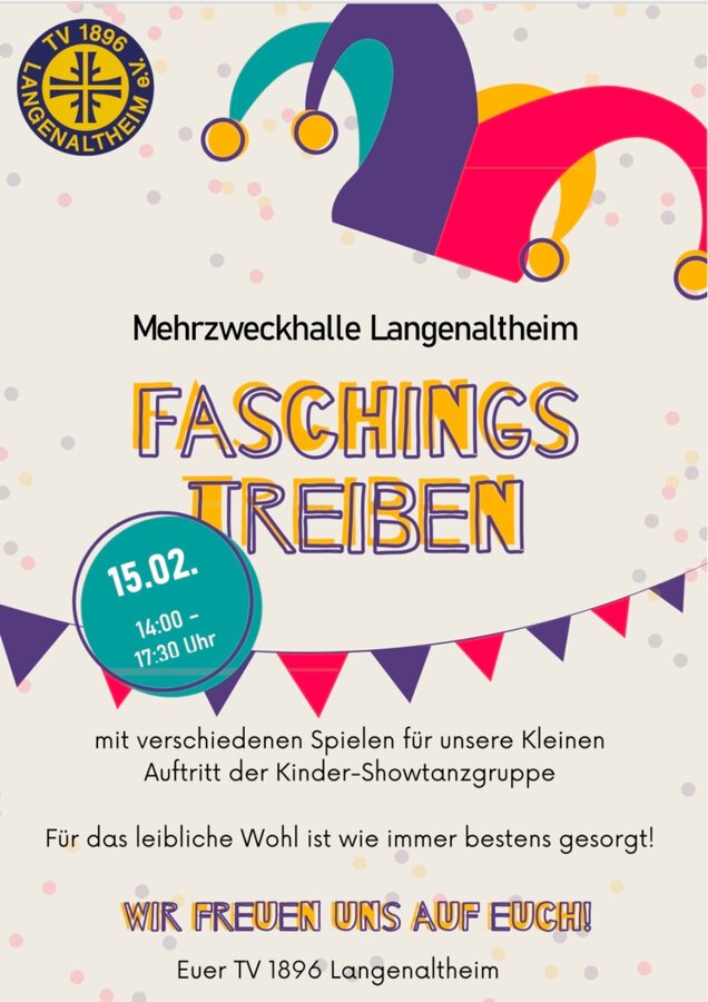 Unser Faschingstreiben findet am 15.02.2026 von 14:00 Uhr bis 17:30 Uhr in der Mehrzweckhalle statt.