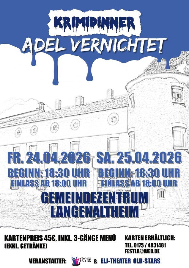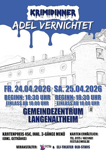 Der FestLA-Verein und die "ELJ-Theater-Old-Stars" freuen sich, euch mit dem Stück "Adel vernichtet" zu einem 3-Gänge-Menü zu unterhalten.